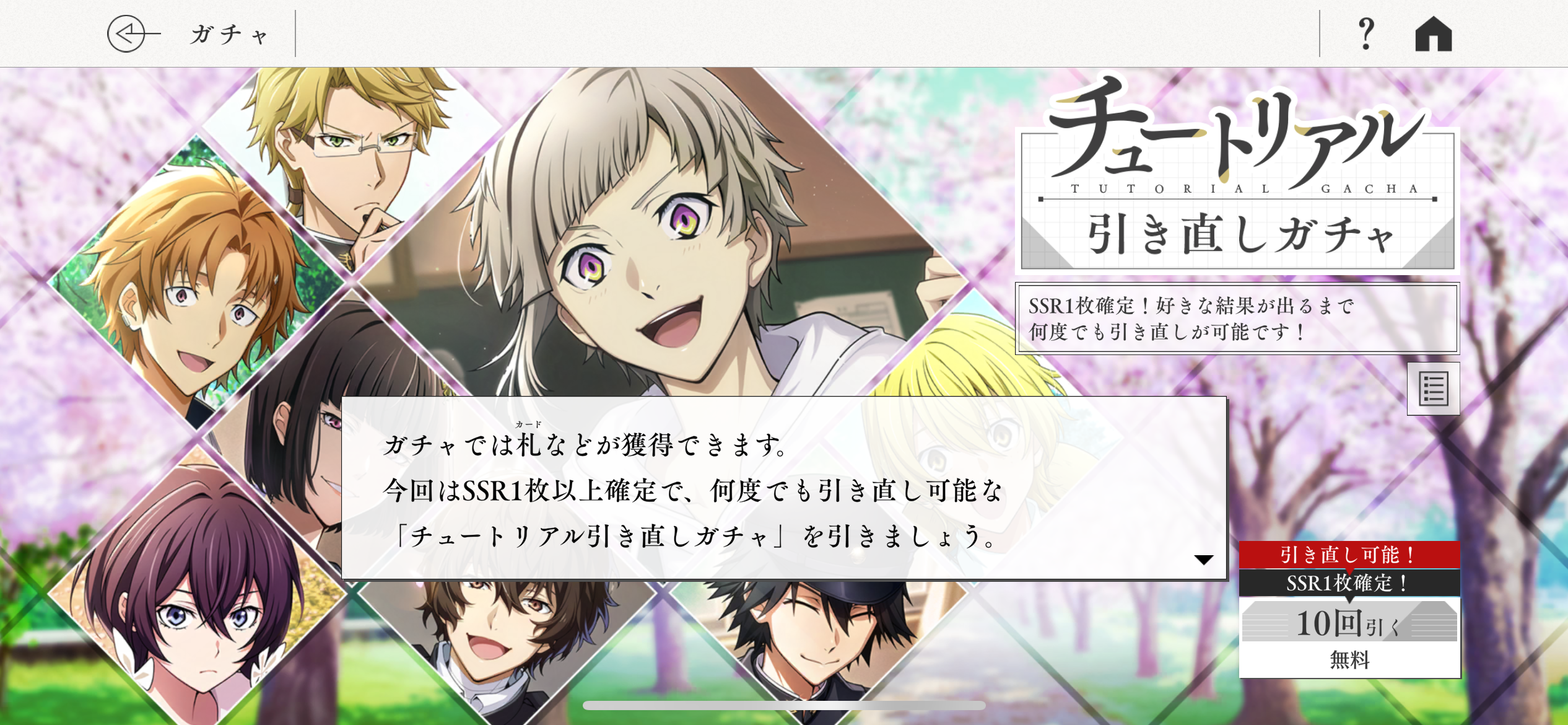 チュートリアル中に引けるガチャは「SSR1体確定」です。ただし、排出されるキャラクターは初期実装の一部メンバーに限定されています。