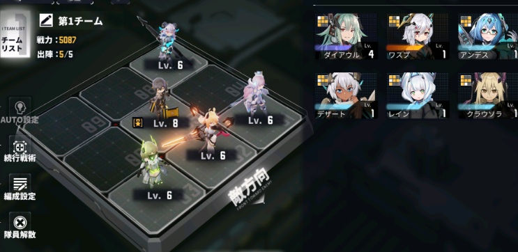 チーム編成画面を見ると、5名で1チームを構成するようです。前列・中列・後列とわかれており、9つのますが存在しています。そこに5名のキャラをどのように配置するかがポイントになりそう。