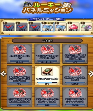 毎日ログインしてパネルを順番にクリアしていくミッションです。難しい内容もありますが、報酬が非常に豪華で、プレミアム装備福引き券50枚、ジェム3000個、装備確定福引き券が獲得できます。優先度が高いため、必ず毎日進めましょう。