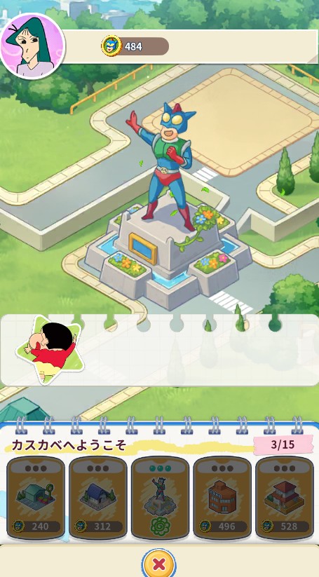 公式サイトでゲームを起動したら、まずはカスカベにコインで建物をたてていきます。しかし、コインがすぐに足りなくなるので、しんちゃんの言う通りに大冒険を開始します。