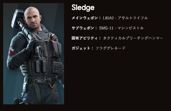 レインボーシックスモバイルでは、様々な攻撃オペレーターが登場します。例えばSledgeというキャラクターを見てみます。