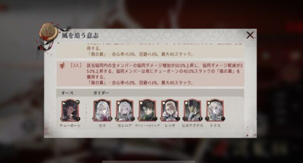 その後、全ての「風を追う意志」メンバーに、この時点のセレニアが持つ「風音の羽」による会心ダメージ増加効果の50.0%**を共有する。12秒間持続する。
