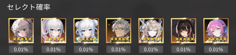 最高レア(SSランク)排出率 特定のキャラは0.01%と非常に低い。そのため、特定のキャラを狙うのはほぼ不可能だと思った方が良い。星5キャラが出ればあたりだと思って続行しよう。