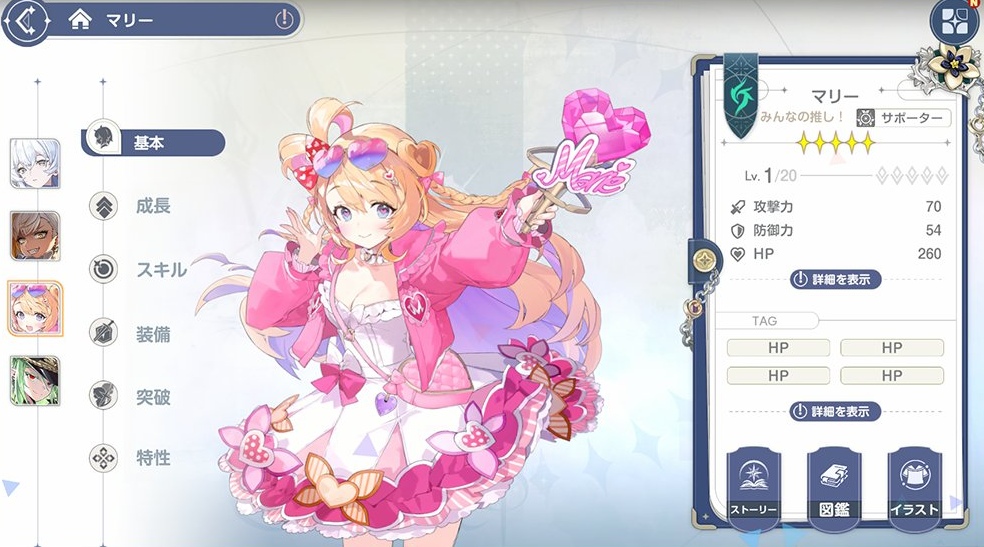 キャラクターのステータス画面をみると、成長、スキル、装備、突破、特性といった要素が出てきています。さらにはステータスには攻撃力、防御力、HPがあり、これらのステータス情報を見る限りはマブラブガールズガーデンと非常にシステムは似てそう。