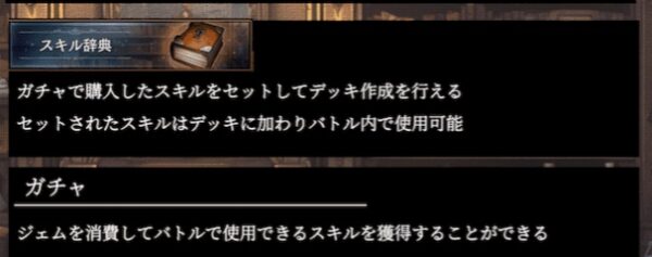 詳しくはこちらに書いてあった、ガチャを使ってスキルを獲得して、デッキ作成をする。そのセットしたスキルを用いてバトルで戦っていくことになる。